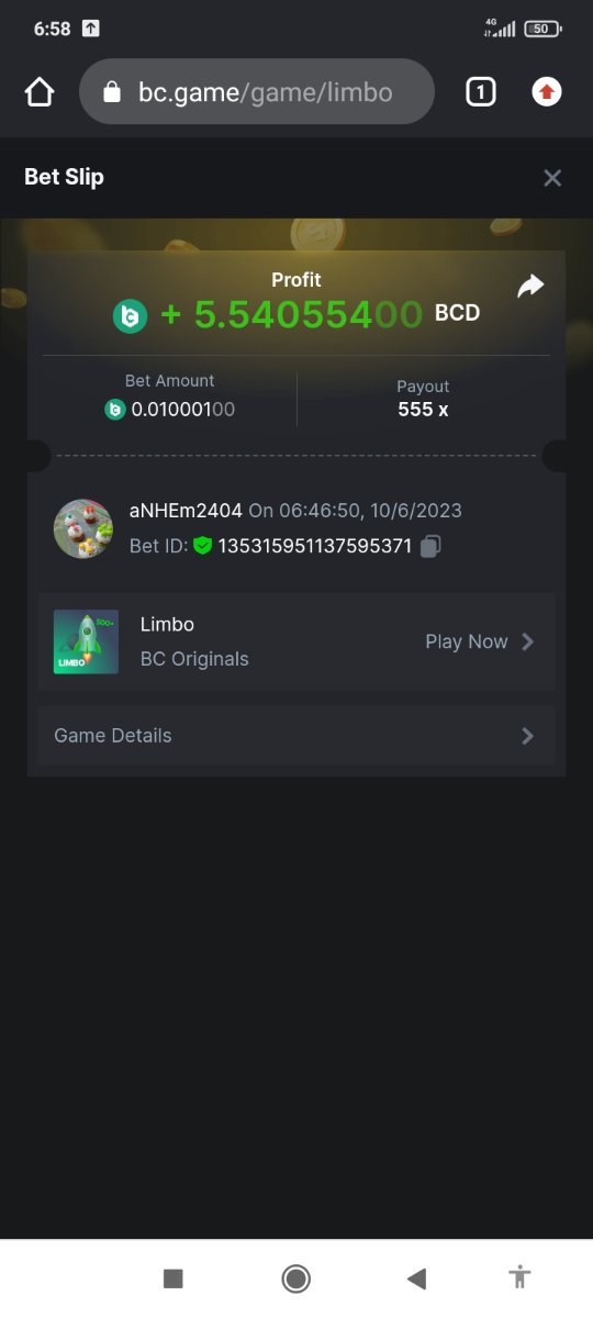 Maksypro Posted June 9, 2023 Share Posted June 9, 2023 Read Carefully Before Start To Hunt Daily Challenges #261 LIMBO Hunt : Win the highest multiplier Min Multiplier requirement 100x Min Level 4 ๏ธDuration Starting : Now End time : 23.59 UTC Time How to Join? Make screenshot + paste your bet link + UID or Profile link Any coin, with min bet 0.01 USD is allowed (jb/bb/bcl not allowed) Reward Prizes 1st Place.....$7 BCD 2nd Place.....$5 BCD 3rd Place.....$4 BCD 4th Place.....$3 BCD 5th Place.....$2 BCD ๐ต Winners will be announcing next day after Roll Point! 1 Link to comment Share on other sites More sharing options...