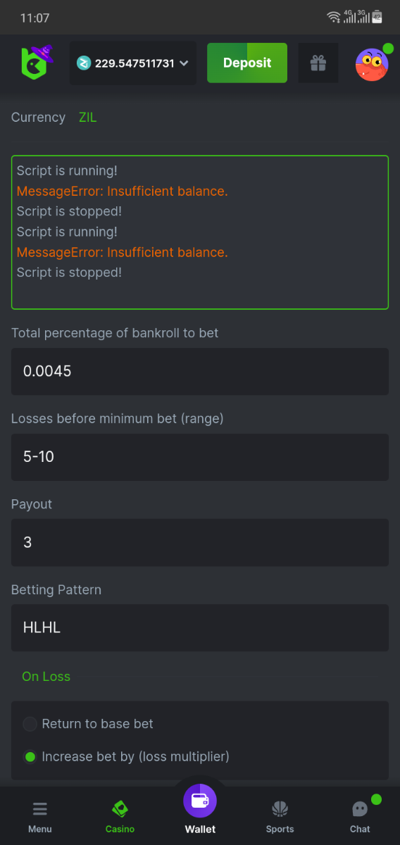 DEATHWHITE Posted October 26, 2023 Share Posted October 26, 2023 I get this script from forum but I can't run . Show error . Please fix for me var config = { betPercentage: { label: 'Total percentage of bankroll to bet', value: 0.00015, type: 'number' }, lossesBeforeMinBet: { label: 'Losses before minimum bet (range)', value: '10-20', type: 'text' }, payout: { label: 'Payout', value: 3, type: 'number' }, bettingPattern: { label: 'Betting Pattern', value: 'HLHL', type: 'text' }, onLoseTitle: { label: 'On Loss', type: 'title' }, onLoss: { label: '', value: 'increase', type: 'radio', options: [{ value: 1.2, label: 'Return to base bet' }, { value: 'increase', label: 'Increase bet by (loss multiplier)' } ] }, lossMultiplier: { label: 'Loss multiplier', value: 1.5, type: 'number' }, onWinTitle: { label: 'On Win', type: 'title' }, onWin: { label: '', value: 'reset', type: 'radio', options: [{ value: 'reset', label: 'Return to base bet' }, { value: 'increase', label: 'Increase bet by (win multiplier)' } ] }, winMultiplier: { label: 'Win multiplier', value: 1.2, type: 'number' }, otherConditionsTitle: { label: 'Stop Settings', type: 'title' }, playOrStop: { label: 'Once loss stop reached, continue betting (Martingale counter reset) or stop betting?', value: 'reset', type: 'radio', options: [{ value: 'stop', label: 'Stop betting' }, { value: 'continue', label: 'Continue betting' } ] }, winGoalAmount: { label: 'Stop once you have made this much', value: 1000000000, type: 'number' }, lossStopAmount: { label: 'Stop betting after losing this much without a win.', value: 4, type: 'number' }, loggingLevel: { label: 'Logging level', value: 'compact', type: 'radio', options: [{ value: 'info', label: 'info' }, { value: 'compact', label: 'compact' }, { value: 'verbose', label: 'verbose' } ] } }; var stop = 0; var lossesForBreak = 0; var roundsToBreakFor = 0; var totalWagers = 0; var netProfit = 0; var totalWins = 0; var totalLoses = 0; var longestWinStreak = 0; var longestLoseStreak = 0; var currentStreak = 0; var loseStreak = 0; var numberOfRoundsToSkip = 0; var currentBet = GetNewBaseBet(); var totalNumberOfGames = 0; var originalbalance = currency.amount; var runningbalance = currency.amount; var consequetiveLostBets = 0; var lossStopAmountVar = config.lossStopAmount.value; function main() { console.log('Starting martingale...');} engine.on('GAME_STARTING', function() { if (stop) { return; } if (numberOfRoundsToSkip > 0) { numberOfRoundsToSkip--; return; } if (lossStopAmountVar > 0 && currency.amount < originalbalance - lossStopAmountVar) { console.log('You have reached the loss stop amount. Stopping...'); stop = 1; return; } if (config.winGoalAmount.value && currency.amount >= originalbalance + config.winGoalAmount.value) { console.log('You have reached the win goal. Stopping...'); stop = 1; return; } var bet = Math.round(currentBet / 100) * 100; engine.bet(bet, config.payout.value); console.log('Betting', bet / 100, 'on', config.payout.value, 'x'); totalNumberOfGames++; totalWagers += currentBet; }); engine.on('GAME_ENDED', function() { var lastGame = engine.history.first(); if (lastGame.wager) { totalWagers -= lastGame.wager; } if (lastGame.cashedAt) { netProfit += lastGame.wager * (lastGame.cashedAt - 1); totalWins++; currentStreak++; loseStreak = 0; if (currentStreak > longestWinStreak) { longestWinStreak = currentStreak; } if (config.onWin.value === 'reset') { currentBet = GetNewBaseBet(); } else { currentBet *= config.winMultiplier.value; } } else { totalLoses++; loseStreak++; currentStreak = 0; if (loseStreak > longestLoseStreak) { longestLoseStreak = loseStreak; } if (config.onLoss.value === 'reset') { currentBet = GetNewBaseBet(); } else { currentBet *= config.lossMultiplier.value; } } runningbalance += (lastGame.cashedAt ? lastGame.wager * (lastGame.cashedAt - 1) : -lastGame.wager); engine.emit('TOTAL_WAGER_UPDATE'); }); engine.on('TOTAL_WAGER_UPDATE', function() { var averageBetSize = totalWagers / totalNumberOfGames; var averageProfit = netProfit / totalNumberOfGames; console.log('***', engine.getBalance() / 100, '***', 'Avg Bet:', Math.round(averageBetSize) / 100, 'Total Games:', totalNumberOfGames, 'Net Profit:', Math.round(netProfit) / 100, 'Avg Profit:', Math.round(averageProfit) / 100, '***'); }); function GetNewBaseBet() { var returnValue = 0; // Get the bet percentage based on the current position in the pattern var bettingPattern = config.bettingPattern.value.toUpperCase(); var patternIndex = totalNumberOfGames % bettingPattern.length; var betPercentage = (bettingPattern[patternIndex] === 'H') ? config.betPercentage.value : (config.betPercentage.value / 2); returnValue = runningbalance * (betPercentage / 100); var percentage = Math.floor(lossesForBreak / roundsToBreakFor * 100); if (percentage < config.lossesBeforeMinBet.value.split('-')[0]) { return Math.max(Math.round(returnValue), 100); } else if (percentage >= config.lossesBeforeMinBet.value.split('-')[1]) { return Math.max(Math.round(returnValue), 1000); } else { var minBet = 100; var maxBet = 1000; var difference = maxBet - minBet; var adjustedPercentage = (percentage - config.lossesBeforeMinBet.value.split('-')[0]) / (config.lossesBeforeMinBet.value.split('-')[1] - config.lossesBeforeMinBet.value.split('-')[0]); var adjustedBet = Math.round(adjustedPercentage * difference); return minBet + adjustedBet; } } console.log('Starting martingale...'); engine.on('GAME_STARTING', function() { console.log('Betting', currentBet / 100, 'bits...'); }); engine.on('GAME_ENDED', function() { var lastGame = engine.history.first(); if (lastGame.cashedAt) { console.log('You won', (lastGame.wager * (lastGame.cashedAt - 1)) / 100, 'bits!'); if (config.playOrStop.value === 'reset') { console.log('Resetting losses...'); lossesForBreak = 0; roundsToBreakFor = 0; currentStreak = 0; numberOfRoundsToSkip = 0; } } else { console.log('You lost', lastGame.wager / 100, 'bits...'); lossesForBreak += lastGame.wager / 100; roundsToBreakFor++; if (consequetiveL