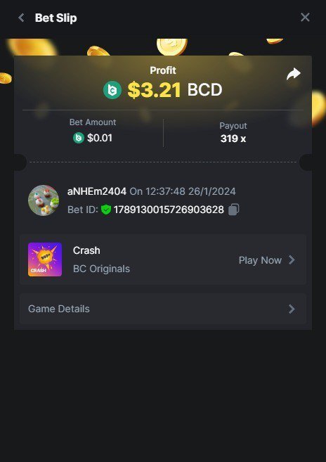 Moderator Giandreas Posted January 26, 2024 Moderator Share Posted January 26, 2024 Read Carefully Before Start To Hunt Forum Daily Challenges #491Hunt : Crash Win the highest pay out Min Payout : x20 Min Level 10️Duration Starting : Now End time : 23.59 UTC Time How to Join? Make screenshot + paste your bet link + UID or Profile link Any coin, with min bet 0.01 USD is allowed (jb/bb/bcl not allowed)Reward Prizes 1st Place.....$7 BCD 2nd Place.....$5 BCD 3rd Place.....$4 BCD 4th Place.....$3 BCD 5th Place.....$2 BCD 🏵 Winners will be announcing next day after Roll Point! 1 Link to comment Share on other sites More sharing options...