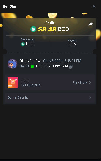 Moderator Giandreas Posted February 6, 2024 Moderator Share Posted February 6, 2024 Read Carefully Before Start To Hunt Forum Daily Challenges #502Hunt : Keno Win the highest pay out Min Payout : x90 Min Level 10️Duration Starting : Now End time : 23.59 UTC Time How to Join? Make screenshot + paste your bet link + UID or Profile link Any coin, with min bet 0.01 USD is allowed (jb/bb/bcl not allowed)Reward Prizes 1st Place.....$7 BCD 2nd Place.....$5 BCD 3rd Place.....$4 BCD 4th Place.....$3 BCD 5th Place.....$2 BCD 🏵 Winners will be announcing next day after Roll Point! Link to comment Share on other sites More sharing options...