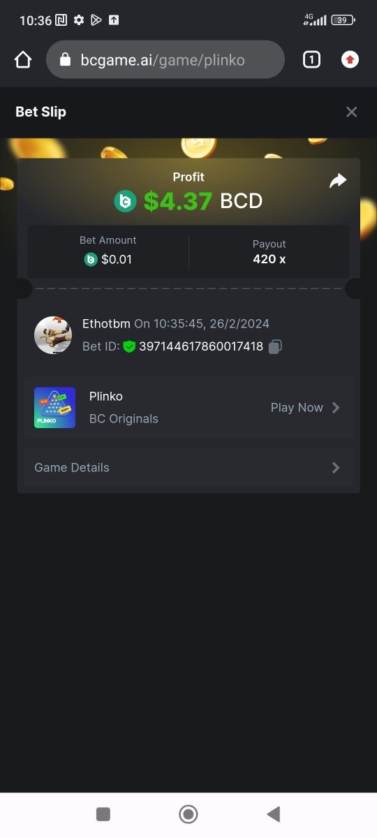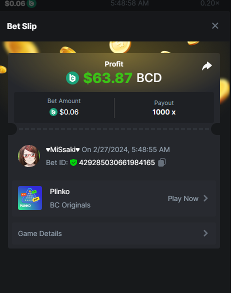 Moderator Giandreas Posted February 26, 2024 Moderator Share Posted February 26, 2024 Read Carefully Before Start To Hunt Forum Daily Challenges #522Hunt : Plinko Win the highest pay out Min Payout : 120x Min Level 10️Duration Starting : Now End time : 23.59 UTC Time How to Join? Make screenshot + paste your bet link + UID or Profile link Any coin, with min bet 0.01 USD is allowed (jb/bb/bcl not allowed)Reward Prizes 1st Place.....$7 BCD 2nd Place.....$5 BCD 3rd Place.....$4 BCD 4th Place.....$3 BCD 5th Place.....$2 BCD 🏵 Winners will be announcing next day after Roll Point! Link to comment Share on other sites More sharing options...