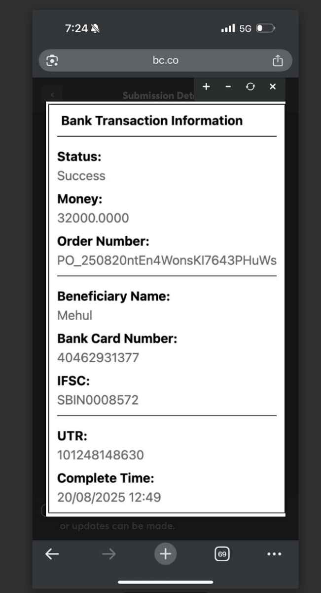 Hyvmiqvgnyb Posted September 9 Share Posted September 9 I am filing an urgent complaint regarding a withdrawal that remains unresolved: Order ID: F-1840955986594521104 Date of supposed payment: 20 Aug 2025 Amount: 32000 Β Support repeatedly states the merchant confirmed payment was successful, but I have not received any funds. A UTR was later provided, but my bank officially confirmed that no such transaction exists. Β This proves the payment was never made. I demand either: A valid UTR with proof of transfer, or An immediate refund. Β If this issue is not resolved within 48 hours, I will escalate with my bank, the RBI Ombudsman, and cybercrime authorities, providing all supporting evidence including the invalid UTR and your repeated confirmations. Β Attached Evidence: Screenshot of UTR provided by support. Bankβs confirmation that no such transaction exists. Password : 0713 Chat logs with BC.Game support. Β I request your urgent attention to resolve this matter. Β Sincerely, User id : 18557322 1 Link to comment Share on other sites More sharing options...