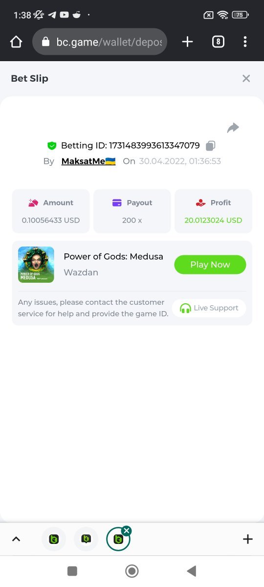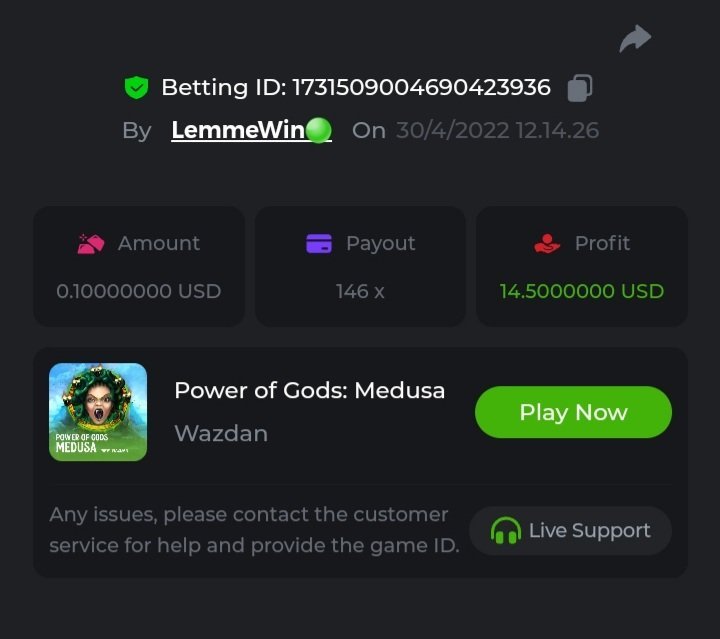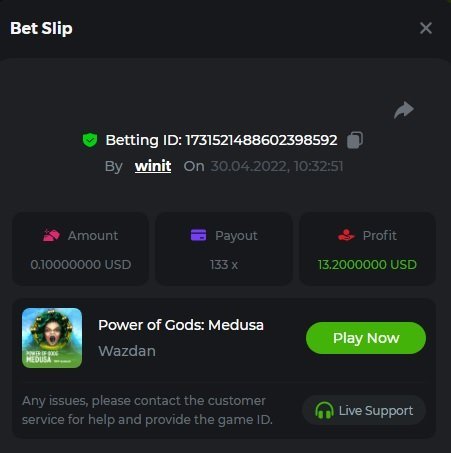 BCGame_POP Posted April 29, 2022 Share Posted April 29, 2022 $2k Wazdan Weekend Multiplier Battle We are hosting this exclusive event for our slot players on the platform for the weekend. Get the best possible multiplier on the highly acclaimed Wazdan Games listed below. All eligible participants will get the prize, hop in your bets within the next 72 hours. Eligible Games: Win the highest multiplier on the Wazdan games listed below 1. Power of Gods: Medusa 2. Jelly Reels 3. Hot Slot 777 Crown The highest multiplier reached in each game will be added together and counted as total points. Bonus buys are allowed. If the player submits multiple winning entries for the same game, the entry with the highest multiplier will be valid. Minimum VIP Tier Must be VIP04 or higher in order to enter this event. Minimum Payout Minimum payout to qualify is 10x (in any game) for a valid entry. Minimum Bet Size Power of Gods: Medusa - $0.1 Jelly Reels - $0.1 Hot Slot 777 Crown - $0.2 Eligible Coins All cryptocurrencies are eligible (excepting JB, and BCL). Free Play Mode is not valid for this event. Prize Pool & Reward Breakdown The winners will win a share of the prize pool based on the detailed ranking below. All other participants who complete all minimum requirements will receive a 35% share of the total prize. How to Enter Access the game to select your Bet ID, click on the Share icon (↷) and then Copy link. Return to the topic, paste the link in the field "Reply to this topic..." E.g.: https://bc.game/sd/?sd=10JHVKPTK0BIFN In the same post, upload a screenshot of your win by clicking the game ID WITH VIEW IN USD mode ENABLED (accessible at the bottom of dropdown menu for your wallet up top, and Submit Reply. Done! This way, we can ensure that your bet indeed met the minimum requirement at the time of placing it: https://bc.game/sd/?sd=10JHVKPTK0BIFN Additional Rules: Please combine all of your hits together in a SINGLE post. Edit your existing post for additional hits, don't create a new post. Bets must be posted within 24 hours of placing bet in order to keep things fair for everyone. Bets must be made during the specified time window stated above. This thread will lock automatically when the time period is over. One (1) entry per household. Anyone found attempting to win multiple prizes will be disqualified from this challenge as well as all future challenges. Failure to follow instructions will result in your submission being null and void. By entering this challenge, you acknowledge that BC.Game has the final decision on results and placement. Payouts will be made within 48 hours of challenge completion. Prizes will be paid out in BCD. Link to comment Share on other sites More sharing options...