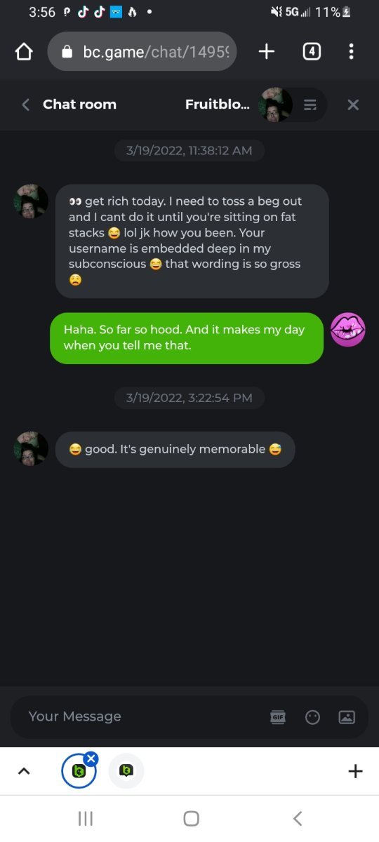 4SkinHoodie Posted June 14, 2022 Share Posted June 14, 2022 My most memorable moment at bc was a couple months after I was permabanned. I always kept an eye on chat for coindrops. When I saw a little blue chat bubble pop up. Now I know that's not surprising to anyone who hasn't been muted before. But it meant I was just tagged by someone. So I opened the chat and saw it was a user named FruitBlood giving me the award for grossest username she's ever read. And how she can't forget it. It still the greatest moment in my bc career. Link to comment Share on other sites More sharing options...